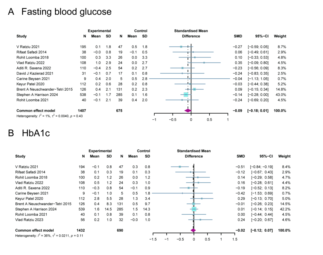 为从临床干预角度验证这一发现,研究者对13项针对肝脏脂肪的靶向药物RCT,共2482名MASLD患者进行了荟萃分析。结果同样表明,与安慰剂相比星速优配,这些能有效降低肝脏脂肪的药物,并未显著改善患者的空腹血糖或HbA1c水平[1]。进一步的元回归分析显示,肝脏脂肪减少的幅度与血糖指标的改善之间,不存在显著的线性关系[1](图3)。