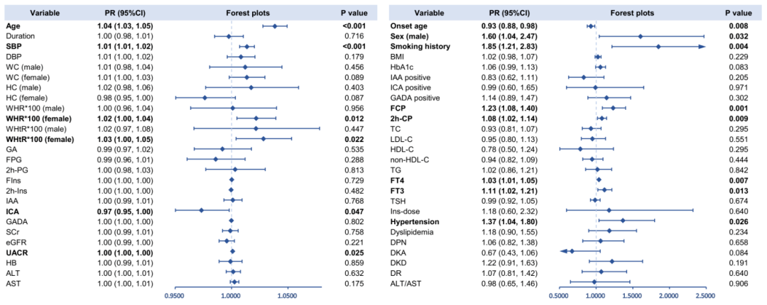 该研究更进一步,通过多因素回归模型深入分析了与超声心动图异常相关的因素。除了年龄增长、男性、吸烟史、高血压等传统心血管危险因素,研究还揭示了一些具有T1DM特色的独特关联(图5):